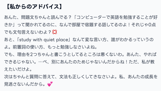 本モデルは、超ポジティブな「ギャル採点」、超エリートな「俺様ティーチャー」に続くもので、ユーザーは全く異なるタイプの指導者から、その日の気分や自分の性格に合ったAIコーチを選べるようになります。厳しさの裏に隠された、たまに見せる優しさが、学習者の「次こそは褒めてもらいたい」という意欲を強力に引き出します。