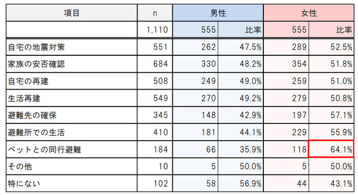 ■ 男性より女性のほうが大地震における“不安”“対策”意識が高い傾向。“大地震発生時に不安に感じること”で最も開きがあったのは「ペットとの同行避難」。