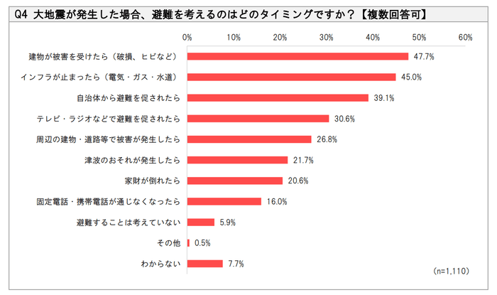 大地震が発生した場合に避難を考えるタイミングを聞いたところ、「建物が被害を受けたら(破損、ヒビなど)(47.7%)」「インフラが止まったら(電気・ガス・水道)(45.0%)」といった、日常生活へ影響を及ぼすタイミングが上位となりました。次いで「自治体から避難を促されたら」が39.1%となりました。