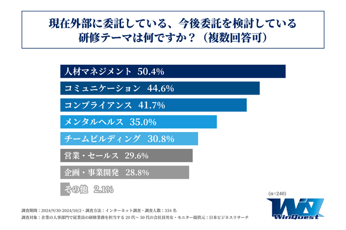 企業が現在外部に研修を依頼している、また今後委託したいと考える研修テーマ第1位は「人材マネジメント」!株式会社ウィンケストが「企業研修会社の活用状況」に関する調査を実施!