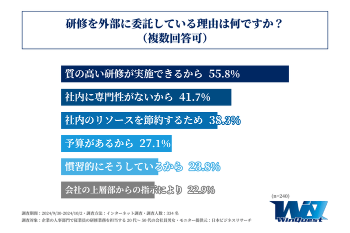 企業が研修を外部に委託する主な理由は「研修の質の高さ」や「社内にない専門性」があるため