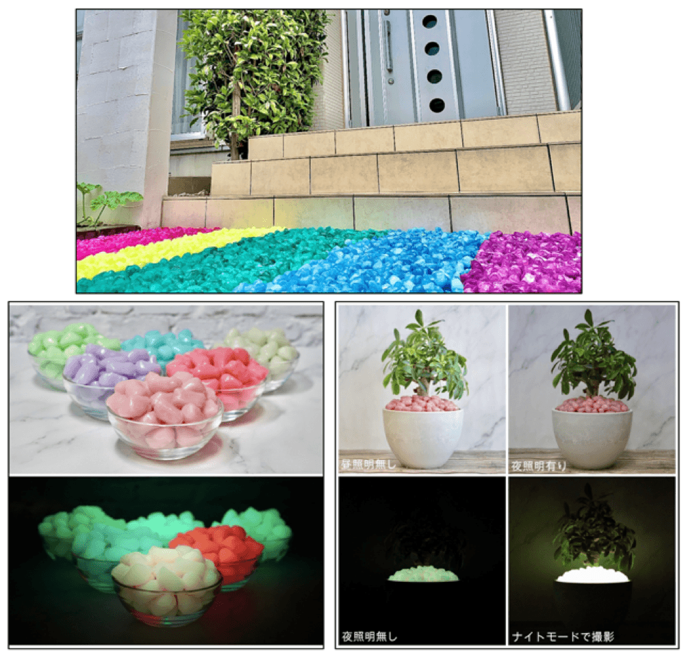 <各マスメディアから問い合わせ多数!> 工場から出る廃プラスチックを再利用したカラフルな 【防犯砂利】に、防災機能を備えた蓄光カラーが新登場!