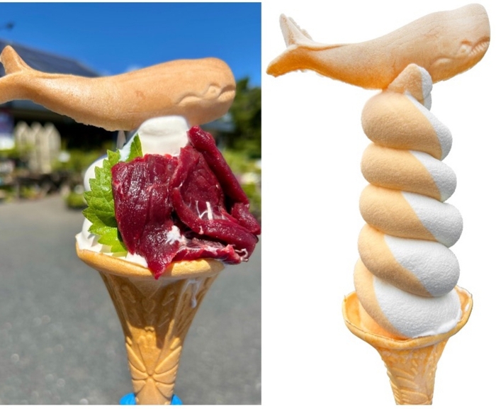 くじらのお刺身をのせた意外!?なソフトクリーム「くじらも吠えーるミルキーくじらソフト」を販売。ミルクソフトの上にくじらのお刺身とくじら最中をトッピング!そのうえに黒胡椒をふりかけ、ユッケダレを別添えでお渡ししています。くじらの旨味とミルクソフトのミルキーな甘さ、ユッケダレのしょっぱさがマッチした意外な美味しさをお楽しみください!