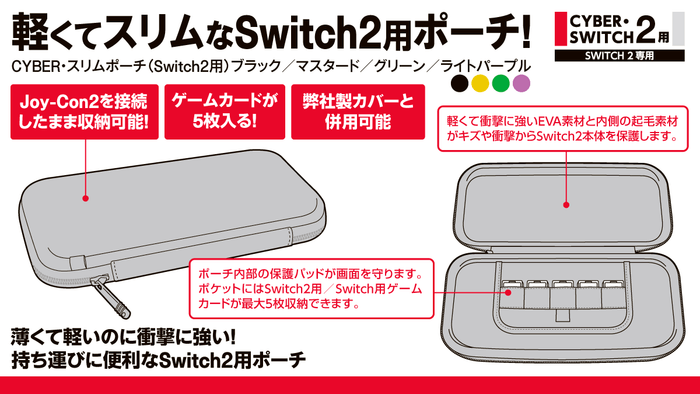 Joy-Con2を接続したままSwitch2本体を収納できる、薄型でコンパクトなポーチです。