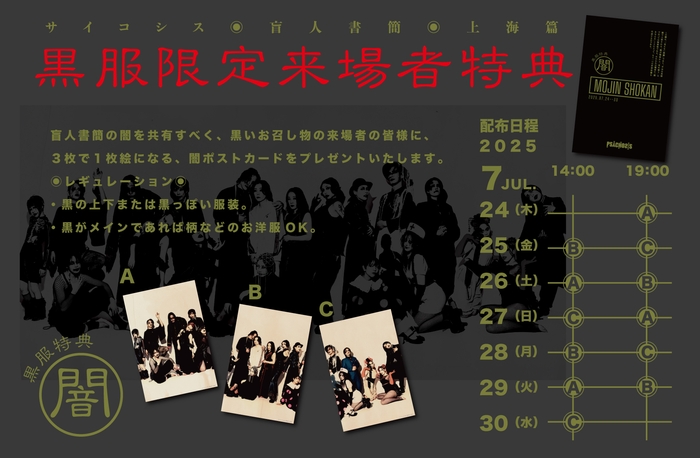 なお、来場者特典として黒服で来場の際にはキャストのヴィジュアルが並んだランダムポストカードが配布される予定。劇場を黒く染めて更なる闇を共有しよう。