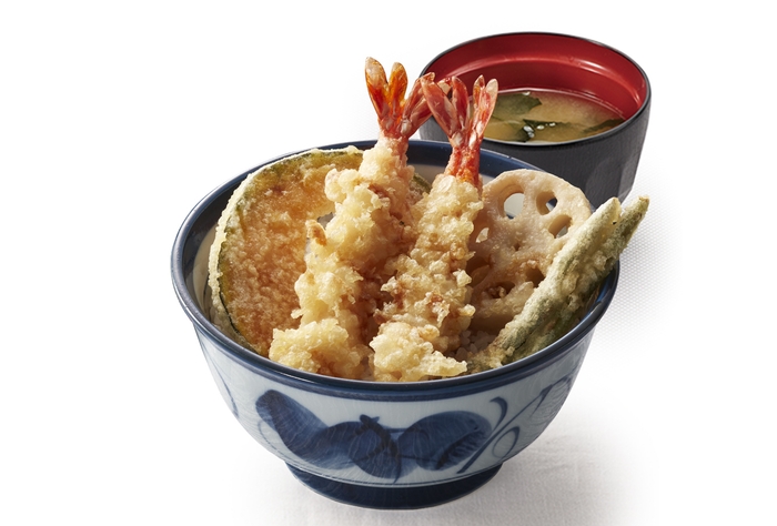 「海老2本、れんこん、かぼちゃ、いんげん」 大人気の海老が2本も入った天丼が他にはない500円と驚きの価格で提供。定番野菜との相性も抜群です。