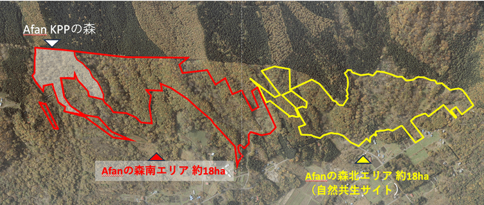 赤色枠:南エリアは、多様性豊かな森を広げるために手入れが必要な森を2009年ごろからトラスト(買取)をおこない、一部の整備整備を進めている生物多様性の回復が必要なエリア。白いエリアを『Afan KPPの森』として共同で森づくりを推進していく。