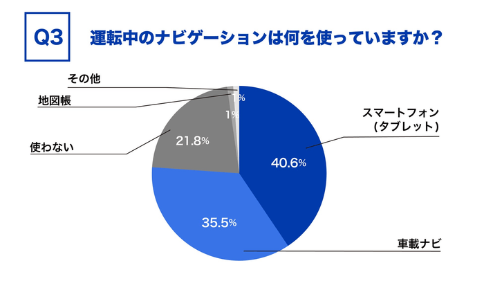 なんと3位にはナビゲーション自体を使わないという回答が21.8%あり、あまり遠出をしなかったり知っている道をドライブする方が多いことが読み取れます。