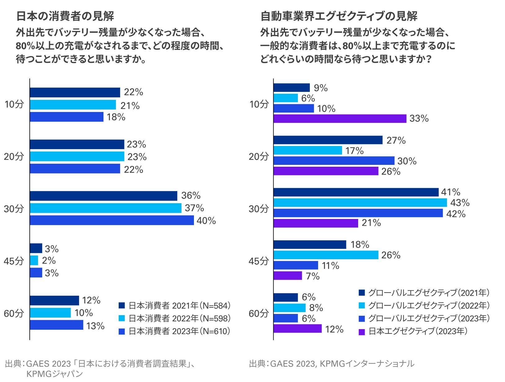 ● BEVが80%充電されるまで待つことができる時間に対して、30分以内と回答した割合はグローバルエグゼクティブ(82%)と日本の消費者(80%)でほぼ同じとなり、日本の消費者の間でBEVの充電について理解が進んできている可能性がある
