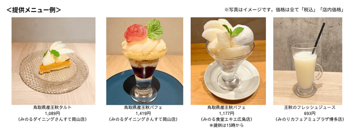 フェアでは、出荷最盛期を迎える「王秋」を使ったオリジナルパフェなど期間限定のスイーツメニューを提供します。また、鳥取県産梨「王秋」はJA全農が運営する産地直送通販サイトJAタウン「全農とっとりJAタウン店」でも購入できます。(https://www.ja-town.com/shop/c/c6001)