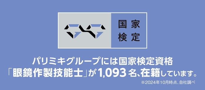 2022年4月より、国の定める「技能検定」の職種に「眼鏡作製職種」が新設され、国家検定資格「眼鏡作製技能士」がスタートし、パリミキグループでは現在1,093名の合格者が在籍しています。(※2024年10月時点、自社調べ)多様化・高度化するお客様のニーズにあわせて、「適切な診断・治療」と「適切な眼鏡作製」の双方の実現に向け、眼鏡技術者が眼科専門医と連携しつつ、皆様により良い眼鏡を提供し、目の健康を守れるよう、眼鏡作製の技能を高めてまいります。