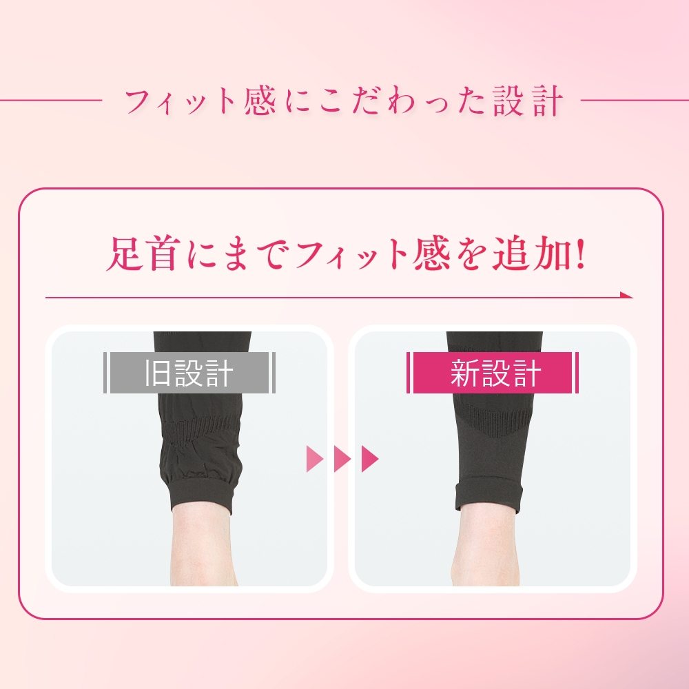 また、足首部分の生地のもたつきをなくし、細く見せたい足首までしっかり着圧を施し、着用時のすっきり魅せるシルエットにまでこだわりました。