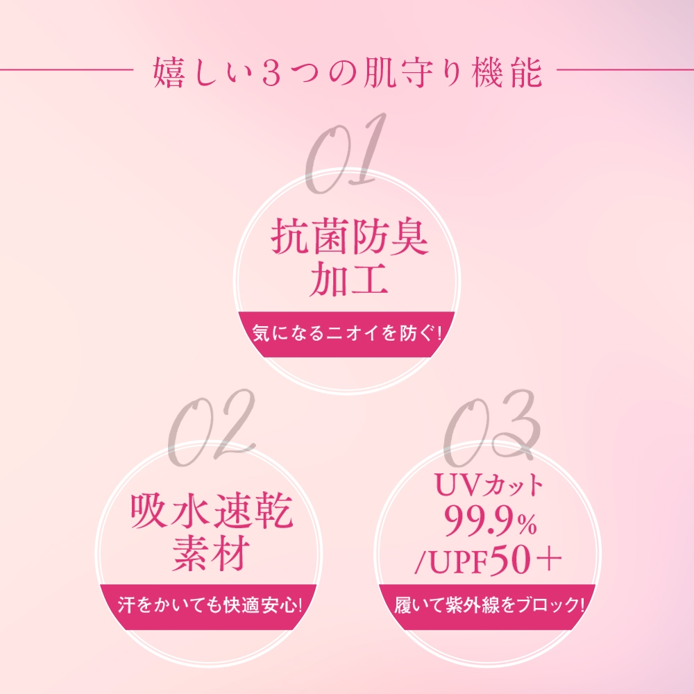 通気性抜群なのに紫外線を「99.9%」カット(UPF50+)し、服を通す強力な紫外線も、履くだけで簡単に肌をダメージから守ります。