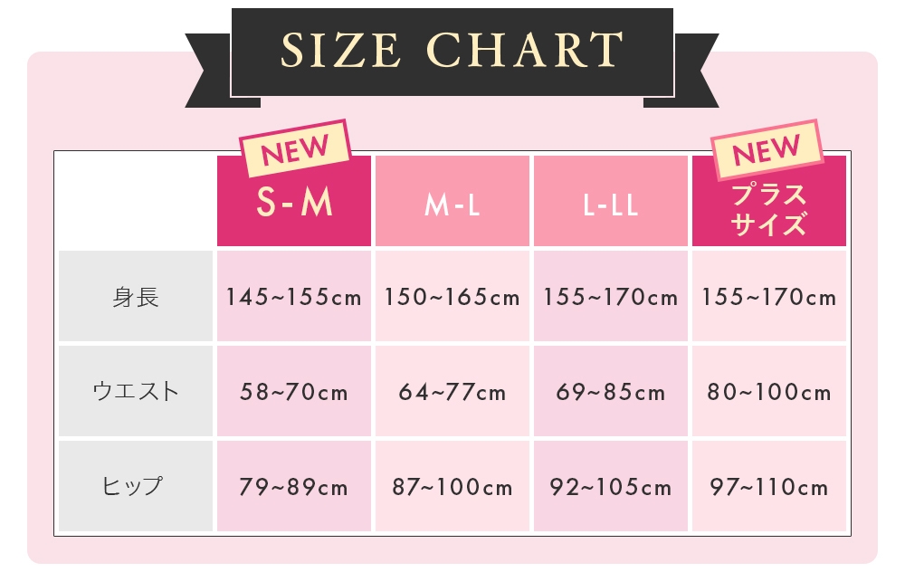 全部で「S-M」「M-L」「L-LL」「プラスサイズ」の4サイズをご用意いたしました。