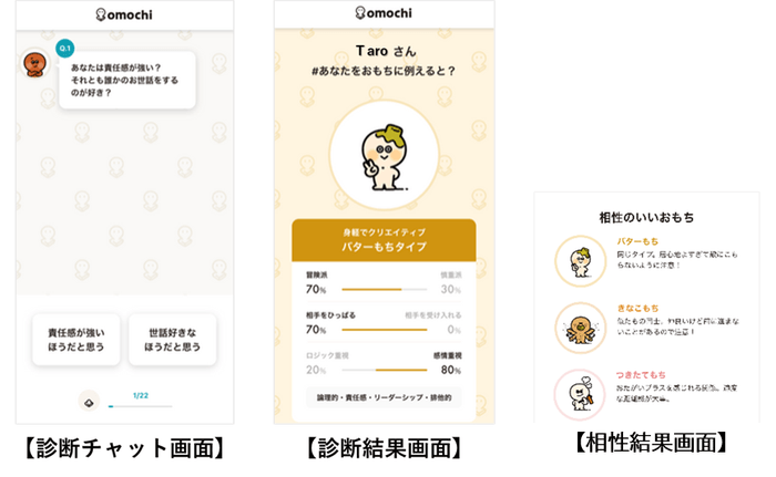 「おもちキャラ診断」をすると、自分と相性のいいおもちキャラも分かります。職場の仲間・先輩や、友だちとの相性を楽しんだり、役割やチームを組んだりするときの参考としても活用できます。