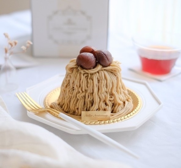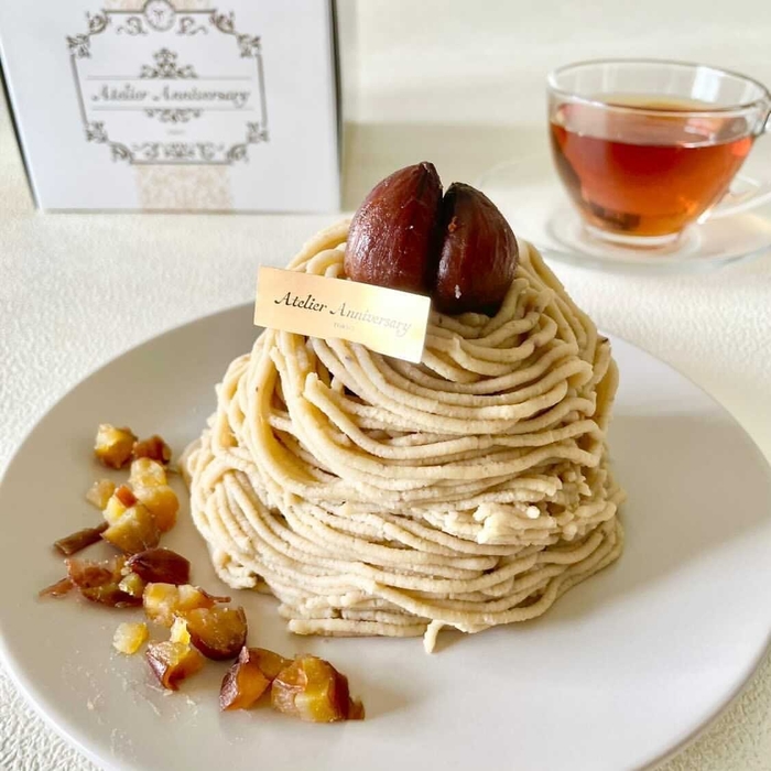 しっとりふわふわなチョコレート味のスポンジ生地に、半分にカットした栗を挟み、創業当初から変わらないAtelier Anniversary特製マロンクリームをふんだんに絞り上げ、最後に栗を丸ごと贅沢に飾り付けて完成です。コクがありながら、なめらかな口当たりのマロンクリームとゴロっと丸ごと使った栗の渋皮煮が絶妙に調和し、秋の味覚を感じさせる逸品です。