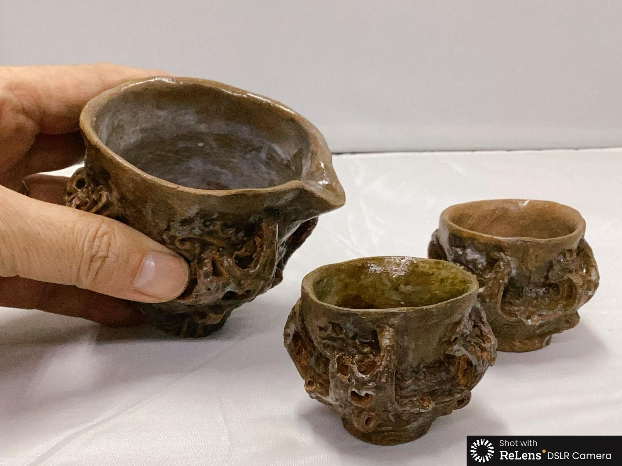 しかし、地元新潟県民にも「縄文」の認知度は低い現状があります。そこで2024年度の作品、火焔型DONABEよりも身近な縄文食器の開発に取り組みました。デザインは、国宝火焔型土器の出土をデザインイメージし、そして生活に身近な、ぐい呑み、コーヒーカップ・湯呑み・ビアグラスなど、多くの食器を商品化。2025年に販売を開始しました。