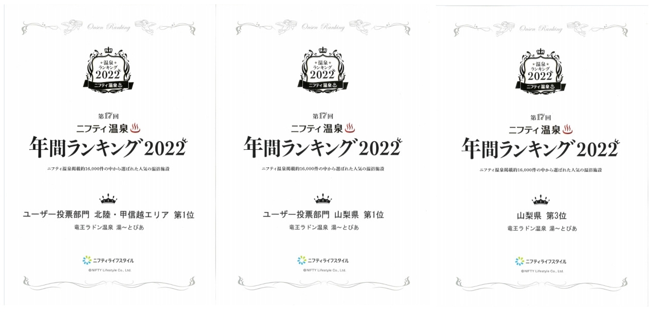 「ニフティ温泉ランキング」は2022年で17年目を迎えたランキングです。「ニフティ温泉」に掲載されている全国16,293件(2022年12月調べ)の温泉・温浴施設を、施設紹介ページの閲覧件数やクチコミ評価、クーポンの利用状況、ユーザー投票などの独自の視点からランキング形式で発表するとされています。2021年12月~2022年11月までの約1年をかけて検討の末、受賞が決定されました。