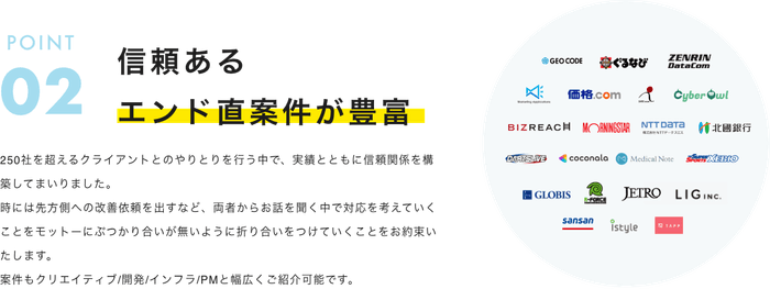 元々はクリエイティブ領域に強いエージェントとして案件の紹介や人材集客を行なっていたが、近年ではシステム開発、プロジェクトマネージャーなど広範囲に渡り紹介が可能となっている。