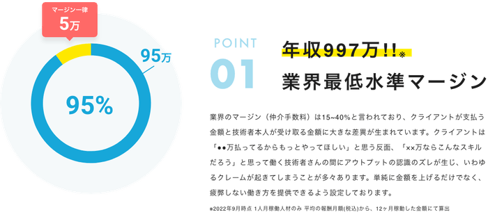 単純に仲介手数料の違いで金額が変わることもあるだろうが、クライアントとの繋がりや提案を含む営業力、稼働中の交渉能力で収入や働きやすさ、クレームの頻度など大きく変わってくるようだ。