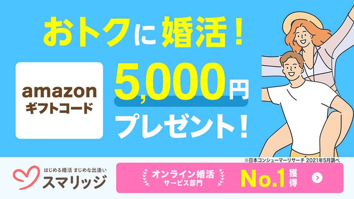 オンラインで完結する婚活支援サービス「スマリッジ」で、アマゾンギフト券5,000円分がプレゼント!