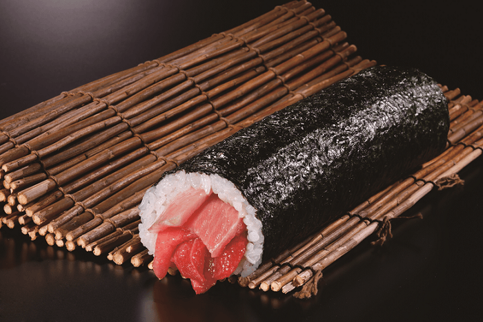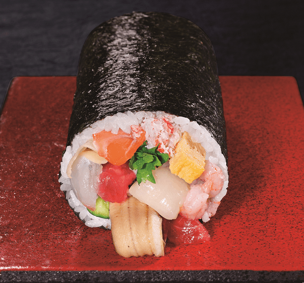 食べやすく粗く刻んだまぐろ赤身と、脂がのった地中海産本まぐろのとろを巻いた贅沢なまぐろ太巻。