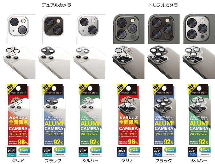 デュアルカメラ用とトリプルカメラ用カメラレンズを守るプロテクターです。クリアタイプは光線透過率96%の表面硬度10H光沢ガラスと薄くて耐久性に優れたポリカーボネイトを使用。アルミタイプは光線透過率92%の表面硬度10H光沢ガラスとiPhone本体に適した高級感のあるアルミフレームを使用。端末本体のレンズ周りまでキズを付けず、美しくカメラレンズを守ります。どちらも貼り付け時に便利なクリーニングクロス・ほこり取りシール付き。