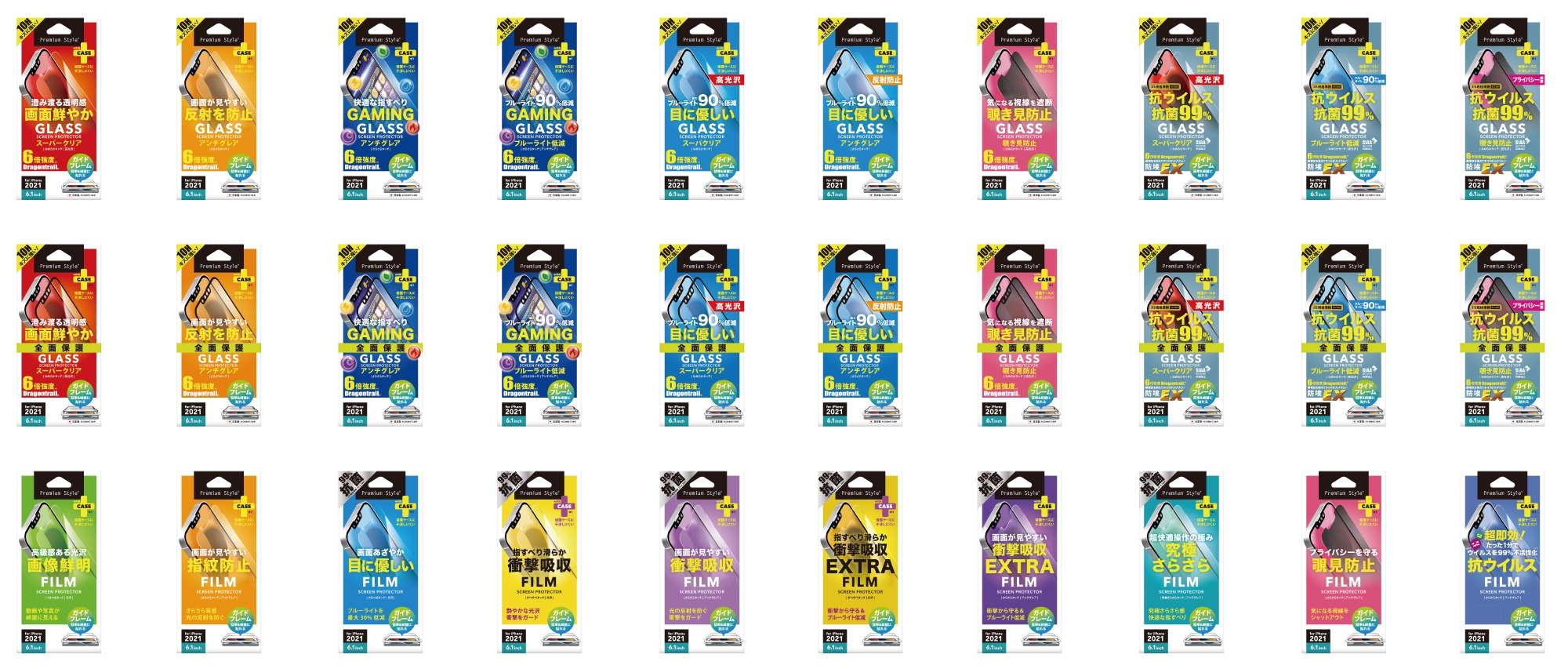 他にも、液晶保護フィルムとして、高光沢、ブルーライト低減30%、抗菌、抗ウイルス仕様、衝撃吸収、指紋防止などをはじめとした、様々なバリエーションで液晶保護フィルムを発売いたします。