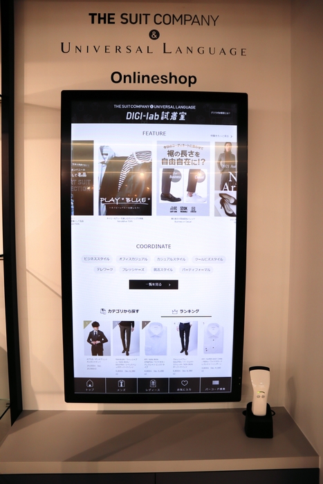 「デジラボ試着室」は、全4ブランドの在庫と連動しているECサイトとリアル店舗の接客サービスの両メリットを最大限に生かした当社独自のシステムです。導入店の店内には、タッチパネル式の大型サイネージやタブレット端末を複数設置し、お客様はこれらの端末を通じて、ECサイトに加えて全国各ブランドの店舗在庫からお好みの商品を選ぶことができます。また、店舗在庫をゲージ見本として試着や採寸が可能なため、実際の商品の色柄や着心地などを確認した上、販売員の接客を受けながら購入することができるのも特徴の一つです。このシステムを利用して商品を購入すると商品は自宅に配送となるため、購入後は手ぶらで帰ることができ、後日店舗に商品を受け取りに行く手間も不要となります。