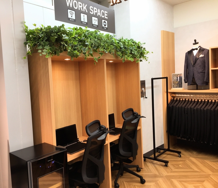 「SUIT SQUARE」第1号店の店内には、出張時や急な対応が必要になった際に利用可能な無料のワークスペースを設置しました。コンセント、フリーWi-Fiを用意するなど、店舗営業中はいつでも利用が可能です。