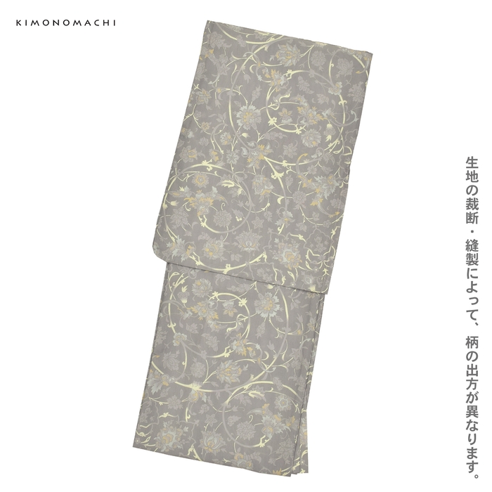 黄みを帯びたグレーの地。グレージュを基調に、薄グレーや浅い黄色の配色の宝相華の文様。円を描く唐草の蔓に明るいクリームイエローの挿し色が連続模様に変化をもたらしています。