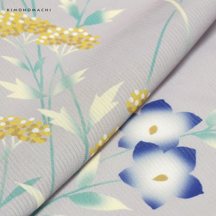 明るいグレーの地に女郎花(おみなえし)などの秋草文様。青磁色にごく淡い黄緑の葉。からし色、黄土色に白などの細かな女郎花の花、青紫ぼかしの桔梗、わずかにグレーのススキの穂など、輪郭線がなくぼかした色彩の表現が優しい印象です。