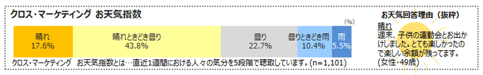クロス・マーケティングお天気指数とは、直近1週間における人々の気分をお天気で表したものです。お天気の理由も一部抜粋してお知らせします。