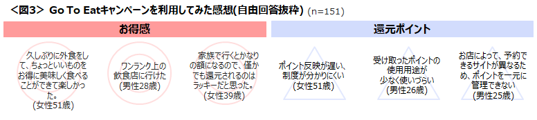 キャンペーンの利用者に、利用してみた感想を聴取したところ、お得感と還元ポイントに関する回答が散見された。還元ポイントについては、付与に時間がかかることや、ポイントが利用できるお店の少なさ、制度の分かりづらさの回答があがった。 <図3>