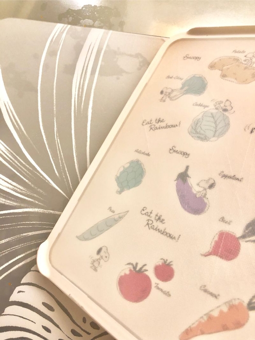 しっかりと使いこめるスグレモノスヌーピー。1枚1700円程度でお値段も手頃です。ヒットの理由、2色買う人のわけ、納得してしまいました。それぞれのスヌーピーがかわいくて、最後にまとめてアップでご紹介します。ポーチなど、他のアイテムに使われていないベジタブルアートが素敵です。