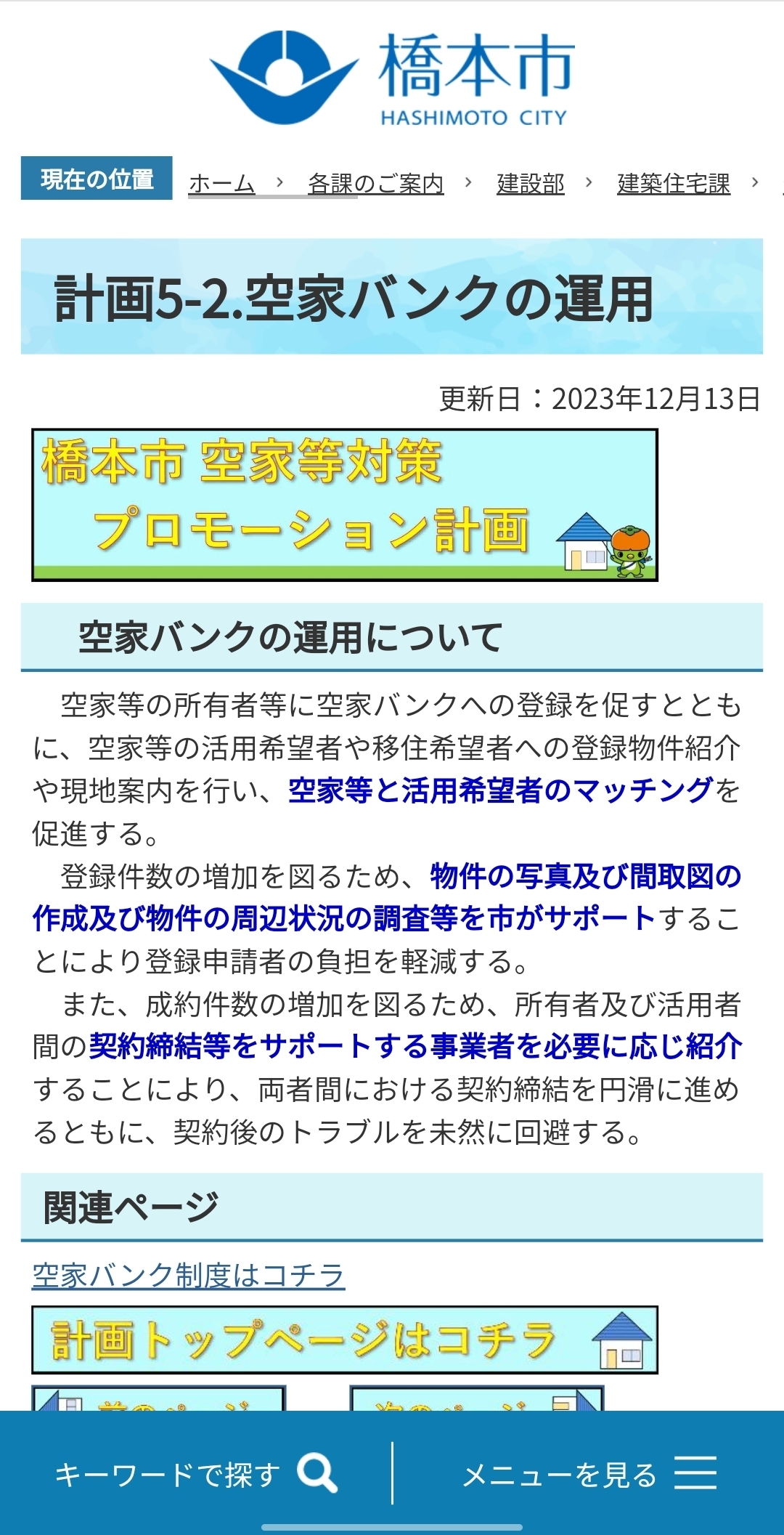 自治体が策定する計画の多くは冊子化した紙媒体の配布やPDF形式でホームページ上に掲載することにより公開されますが、上記URLのとおり、市HP上に『橋本市空家等対策プロモーション計画』というカテゴリを作成し、その中に項目ごとのページを作成するという方式で公開します。PDF形式と異なり、閲覧する端末の設定により文字サイズが自動調整されるため、スマートフォンやタブレットで閲覧しやすいこと、【空家等及びその跡地の活用の促進】という項目のページに実際の空家バンク制度のページの内部リンクを貼り付けるなど記載ページ内に関連する制度等のURLを掲載することで、各関連制度のページ閲覧数増加に直結することを狙っています。