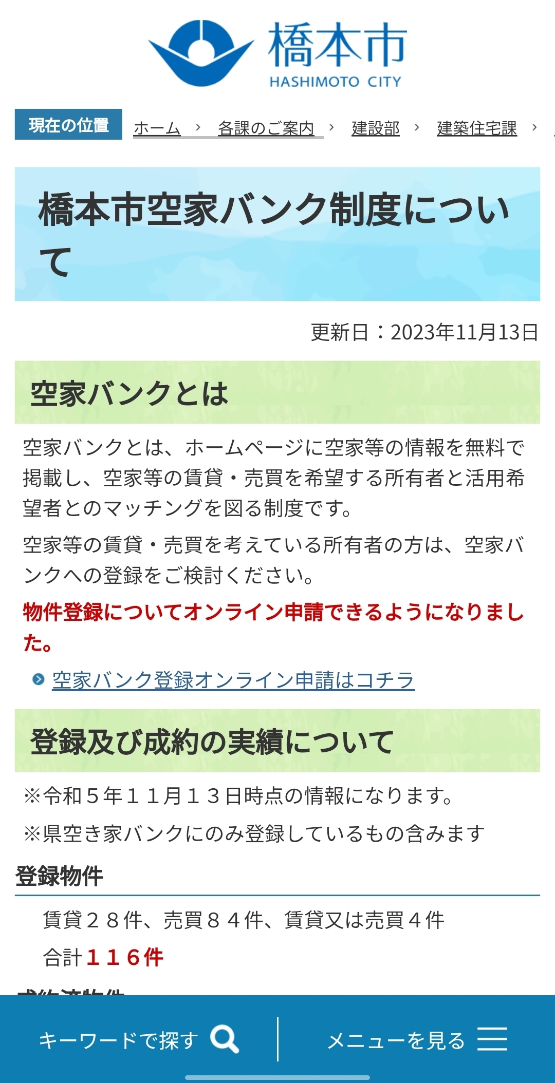 和歌山県空家バンク制度の市窓口設置により平成27年11月から登録開始、橋本市空家バンク制度を令和2年4月から運用開始。令和5年11月1日時点の実績は、物件登録116件、売買又は賃貸の成約92件。