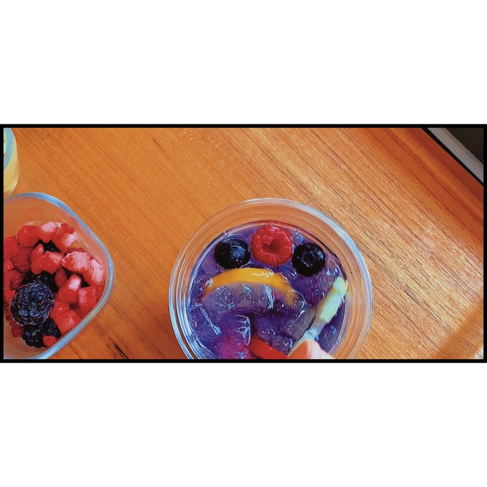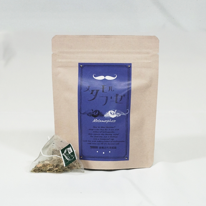 PJ クルックの作品《メタモルフォーゼ》をイメージしたハーブティーです。ローズマリーのほろ苦い風味とユーカリの爽やかな清涼感。メタモルフォーゼ=変身という意味合いの通り、透き通った青色にレモンを加えると紫に変化します。