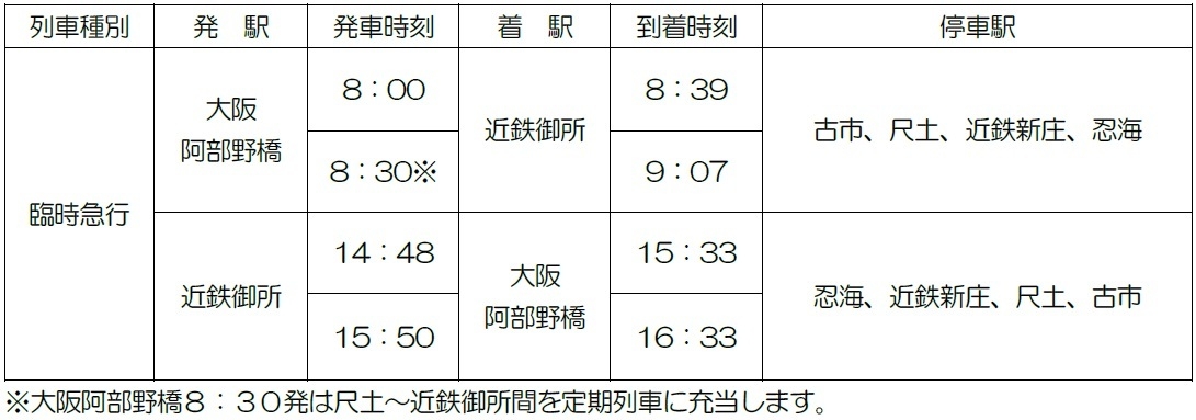 各日、大阪阿部野橋駅発・近鉄御所駅行き2列車、近鉄御所駅発・大阪阿部野橋駅行き2列車の計4列車を増便します。※臨時列車は近鉄御所駅で奈良交通の葛城ロープウェイ前行き臨時バスと連絡しています。