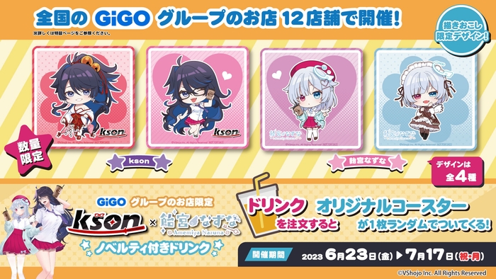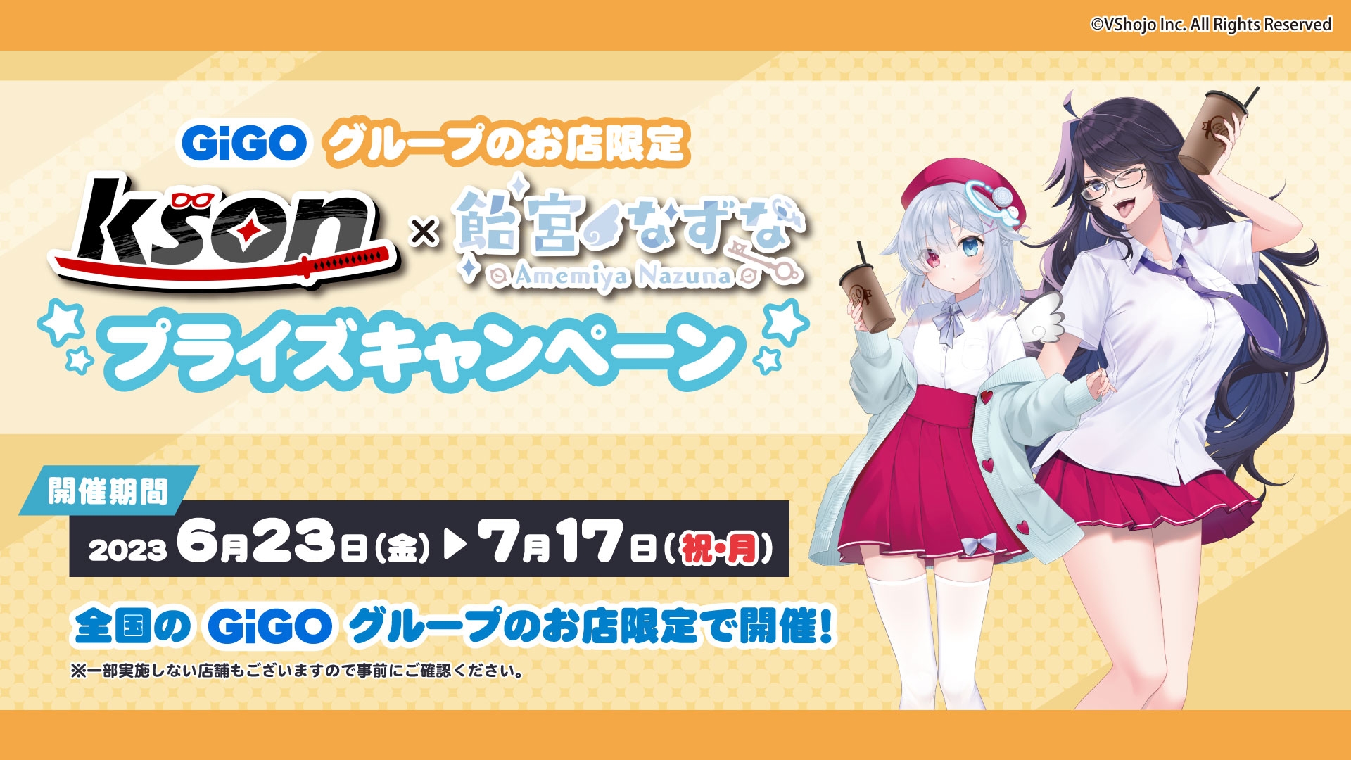 株式会社GENDA GiGO Entertainment(本社:東京都港区 代表取締役社長:二宮 一浩 以下当社)は、GiGOグループのお店におきましてVShojo Inc.(米国)所属のVTuber 『kson (ケイソン)』・『飴宮なずな』の両名とコラボレーションした、「kson×飴宮なずな」キャンペーンを2023年6月23日(金)から開催いたします。