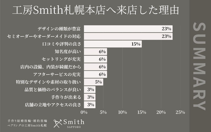 この調査結果から、お客様はSmith札幌に対して、多様なデザインの中から自分だけの指輪を作れる柔軟な対応を求めていることが分かります。