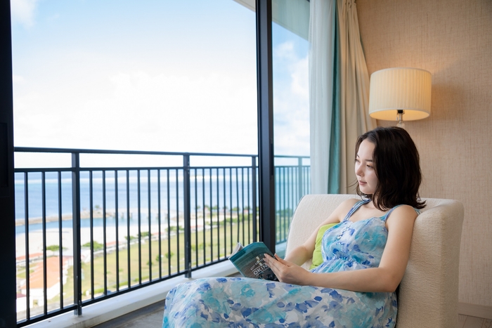 お部屋は東シナ海の眺望とハイグレードな客室、充実のアメニティで“ワンランク上”のホテルステイをお楽しみいただける最上階へご滞在。青い海、青い空はもちろん、サンセットにマジックアワーと変わりゆく景色が、非日常へと誘います。