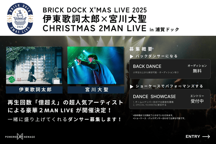 ダンスイベント企画団体 NEWAGE(ニューエイジ)は、2025年12月25日(木)に神奈川県横須賀市・浦賀ドックで開催される大型クリスマスライブ「BRICK DOCK X’MAS LIVE 2025」(主催:BRICK DOCK実行委員会)において、出演アーティスト 伊東歌詞太郎、宮川大聖 両氏のステージを彩るバックダンサーオーディションおよび出演者募集を開始しました。
