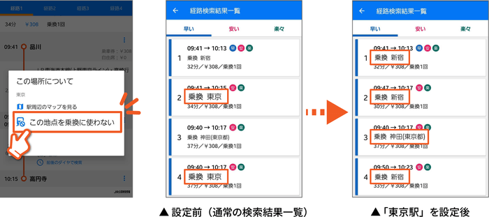 「乗換に使わない駅」は、経路検索結果から、乗換に使いたくない駅・バス停があった際に、駅名・バス停名横のメニューをタップし、「この地点を乗換に使わない」をタップすることで登録できます。