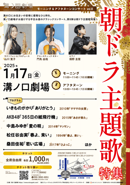 溝ノ口劇場主催、『モーニング & アフタヌーンコンサート vol.8』-朝の連ドラ主題歌特集-が2025年1月17日 (金)に溝ノ口劇場(神奈川県川崎市高津区久本3丁目1-5)にて開催されます。