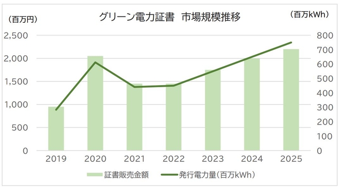 ・2022年度の市場規模は、発行電力量ベースで4.5億kWh、証書の販売金額ベースで約14.5億円になると推定される。