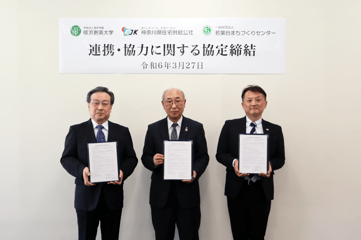 この度、学校法人堀井学園横浜創英大学(以下、「横浜創英大学」という。)と神奈川県住宅供給公社(以下「公社」という。)及び一般財団法人若葉台まちづくりセンター(以下「センター」という。)は、横浜若葉台団地(以下「横浜若葉台」という。)において、高齢世代の健康の維持増進、子どもの健全な発達等を目的とした取り組みを行うとともに住宅居住者の健康増進等を図り、団地及びその関連施設、周辺地域の活性化に資することを目的とした連携・協力に関する協定を、令和6年3月27日に締結しました。