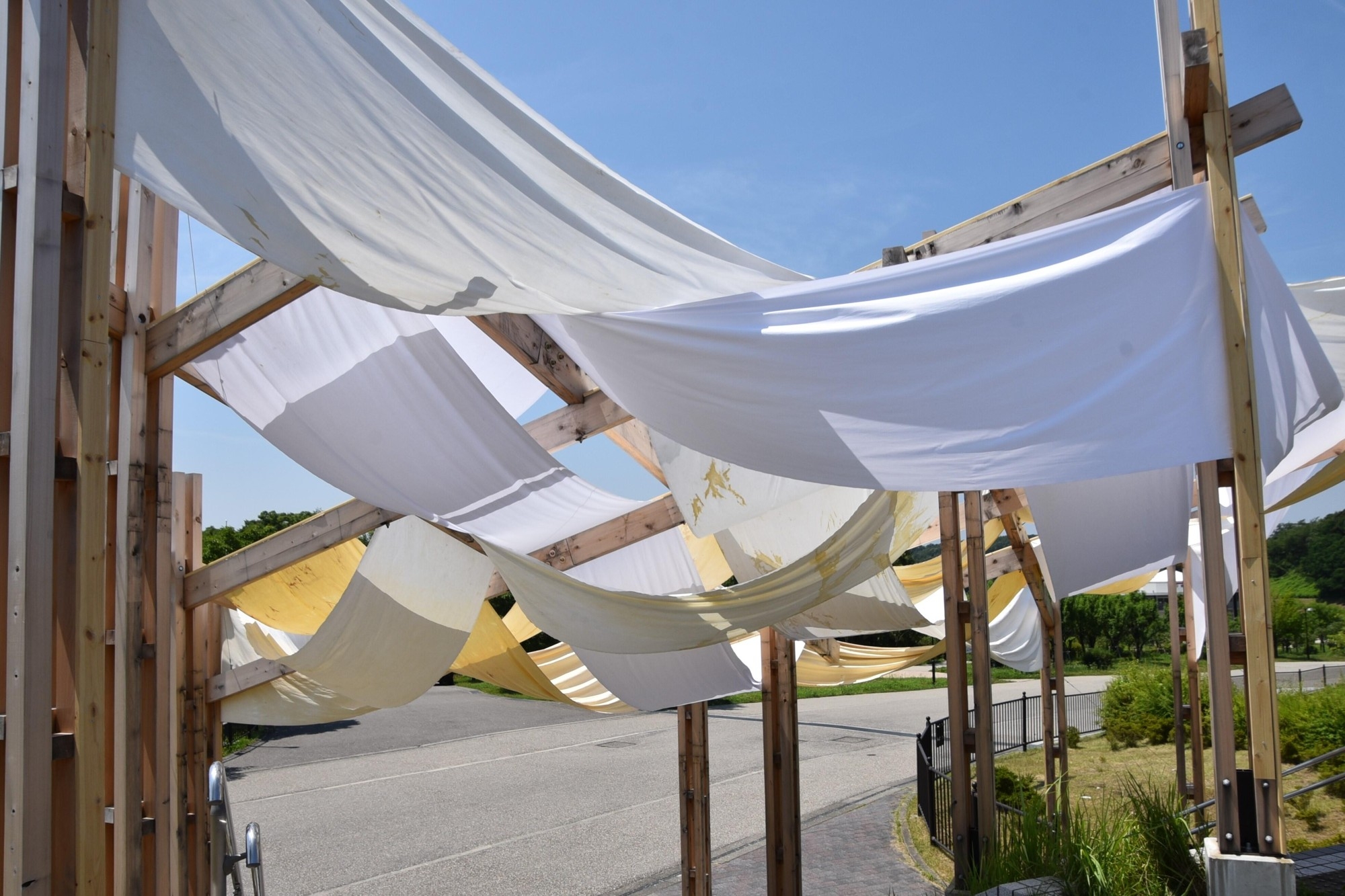 「長雨の季節に入り 山々の緑は一層深みを増して行く。その晴れ間に吹く風は夏の気配を感じさせる。階段の高低差を利用し、包まれるような空間を作った。大きな綿布は日光の陰影や、風の流れを可視化する。上り下りする中で身の回りの自然に目を向けてもらうことを考えた」