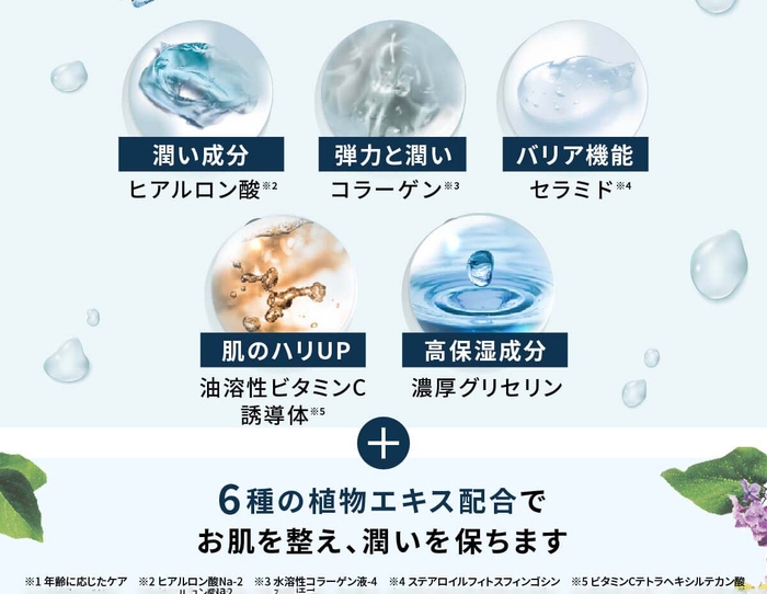 美容保湿成分の「ヒアルロン酸※4」、「コラーゲン※5」、「セラミド※6」、「油溶性ビタミンC誘導体※7」、「濃厚グリセリン※8」を配合で、乾燥肌に優れた効果を発揮します。さらに、6種の植物エキス※9がお肌を整え、潤いを保ちます。