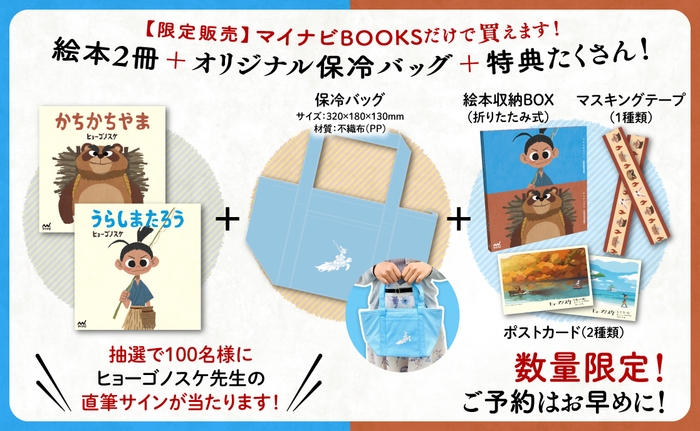 「マイナビブックス」で販売するセットの内容は、絵本2冊の他に、オリジナルの保冷バッグ、マスキングテープ、絵本収納ボックス、ポストカード2枚となっています。